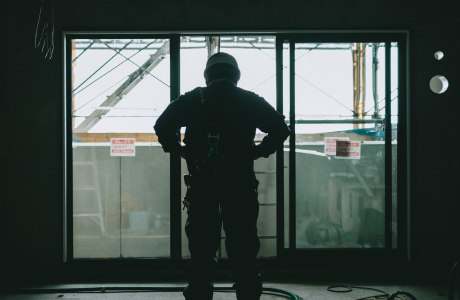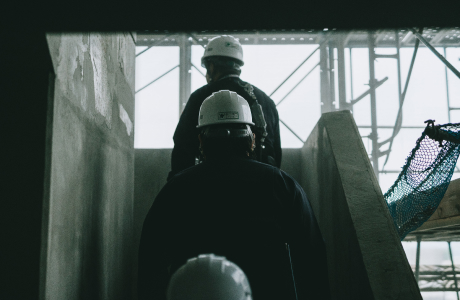 建築現場で朝礼。